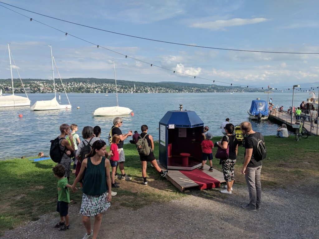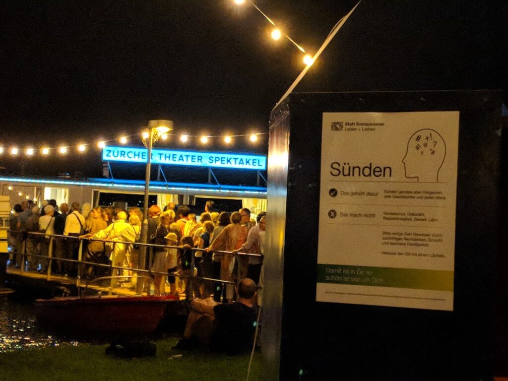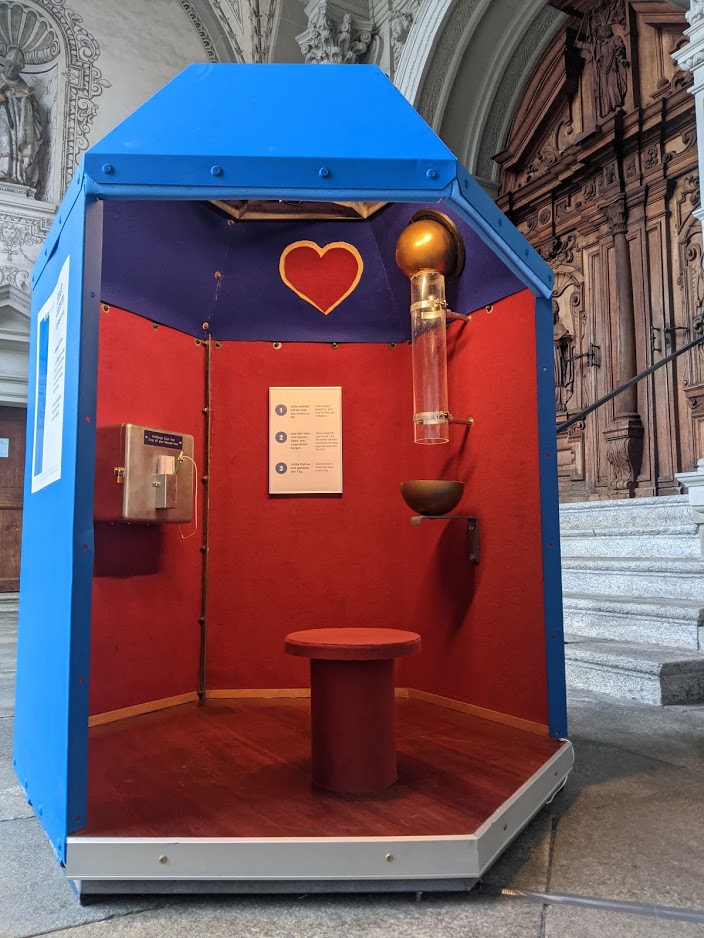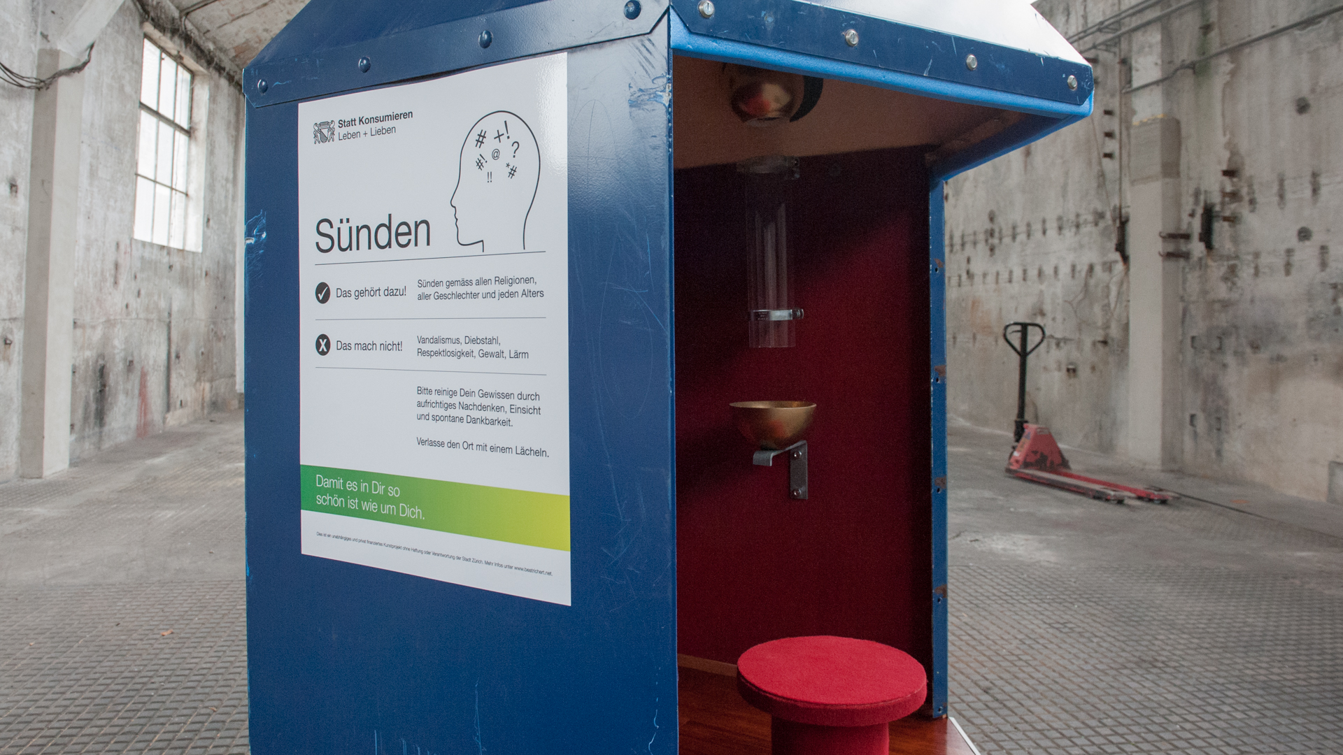 Die begehbare Kunstinstallation wurde als Sünden-Entsorgestelle am Zürcher Theaterspektakel 2019 ur-ausgestellt.