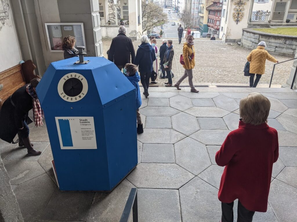 Durch meine Kunstaktion realisierte ich, wie stark der Begriff Sünde mit Religion verbunden ist. Um die Kunstinstallation einerseits von dieser Verbindung zu lösen und andererseits auf die aktuelle Lage während der COVID-19 Pandemie einzugehen, wurde aus der Sünden-Entsorgestelle ganz einfach die EntSorgeStelle. In Zusammenarbeit mit der Stadt Luzern, sowie der Katholischen und Reformierten Kirche der Stadt Luzern wurde die EntSorgeStelle während der Passionszeit im Februar und März 2021 vor dem Haupteingang der Luzerner Hofkirche installiert.