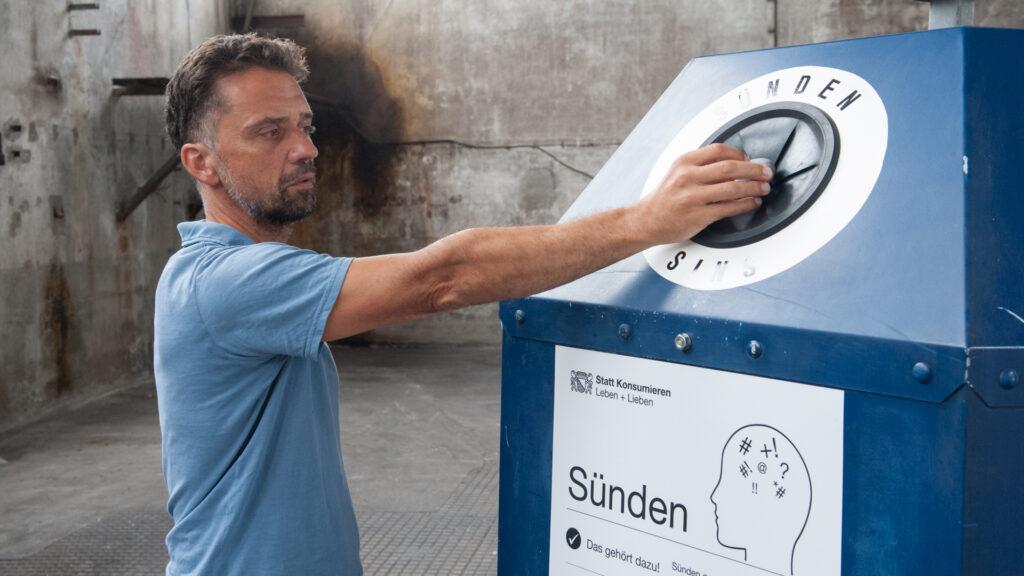 Dieses erstaunliche Ritual, das mir viel mehr Überkonsum-Ablasshandel als nachhaltiges Recycling schien, wollte ich noch effizienter gestalten. Für meine Kunstinstallation hat mir die Stadt Zürich einen ikonischen, sechseckigen Glas Recycling Container kostenlos zur Verfügung gestellt. Diesen baute ich mit Hilfe meines Bruders in eine begehbare Sünden-Entsorgestelle um. Somit war es ab sofort möglich, den durch das Entsorgen verdrängte Gang in die Kirche beim Recyclen zu integrieren. Nach Alu, Karton, Batterien und Grünglas noch schnell die Sünden zu entsorgen.